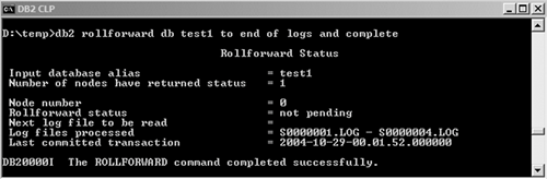 The logs in this directory are: S0000000.LOG, S0000001.LOG, S0000002.LOG, and S0000003.LOG. Transfer all of these logs to the test server and into the active log directory of TEST1, which is on D:\DB2\NODE0000\SQL00001\SQLOGDIR\. (If you list this directory, you will see that it is currently empty.) Perform a roll forward operation on TEST1, as shown in Figure 13.23. Figure 13.23. Performing the roll forward operation on TEST1