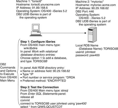 Step 1: Configure iSeries | From the OS/400 Main menu, type: wrkrdbdire After you press Enter, this will bring up the Work with Relational Database Directory Entries panel. | No corresponding information required on this machine. | From the Work with Relational Database Directory Entries panel: | TORISC6B is the local RDB name you want to access on machine 2. In order to determine the local RDB name, contact your iSeries administrator, who can issue the command WRKRDBDIRE. When the Work with Relational Database Directory Entries panel appears, the administrator can find the desired value in column Relational Database that maps to the column Remote Location with a value of *LOCAL. | In the Add RDB Directory Entry panel, specify: Note: The hostname could have been used instead of the IP address. After you specify *IP for the TCP/IP protocol and press Enter, other choices will appear: Note: *DRDA is equivalent to entering port 446. This value is very unlikely to be changed. *ENCRYPTED authentication works between iSeries machines. Versions other than DB2 for iSeries 5.2 may not have some of these choices. | For this example: 90.29.168.62 = the IP address of machine 2 *DRDA = the port used for DB2 *DRDA is equivalent to port 446 and is the default value. | Step 2: Test the Connection | Start the Interactive SQL tool from the OS/400 Main menu: strsql From the Enter SQL Statements panel, type: CONNECT TO TORISC6B USER johntest USING 'psw400' (Press Enter) SELECT * FROM QIWS.QCUSTCDT (Press Enter) Note: The password needs to be passed in single quotes in order to maintain its case. Using double quotes for the user ID as shown below also works: CONNECT TO TORISC6B USER "johntest" USING 'psw400' (Press Enter) | For this example: johntest = the user ID as defined on machine 2 psw400 = the password as defined on machine 2 |