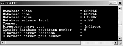 | 4. | Confirm that the correct database values appear in the database directory using the list db directory command. The database name in the client's database directory must match the database alias in the server's database directory (see Figure F.6).