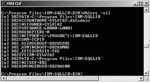| 2. | Check the DB2COMM registry variable to verify that the correct communication protocol is specified by using the db2set all command (see Figure F.3).