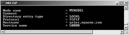 Figure F.5. Checking the node directory on a client  Alternatively, the client can specify a service name instead of the port number in the node directory. However, this service name is to be defined at the client services file, not the server services file. For example, the node directory can have the service name db2conn. If this is the case, then in the client's services file, you must set db2conn to 50000: