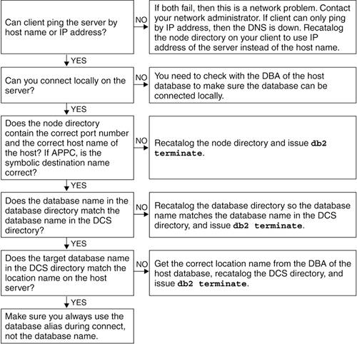 | Figure F.8 displays a flowchart for diagnosing client-server connectivity problems. It summarizes what we have discussed so far. The client is a DB2 client; the server can be either a DB2 UDB server or a DB2 Connect gateway. Figure F.8. Diagnostic flowchart for client-server connectivity problems  Figure F.9 displays a flowchart for diagnosing client-host connectivity problems. Figure F.9. Diagnostic path for client-host connection problems  In Figure F.9, the client has at least DB2 Connect Personal Edition installed (review Scenario 3 in Chapter 6). For a three-tier configuration where a DB2 Connect gateway works as the middle tier, the diagnosing path splits into two parts. First, you need to make sure the connection is working from the Connect gateway to the host database. For this, use the flowchart in Figure F.9. Second, for the client-gateway connection, use the flowchart in Figure F.8. |
