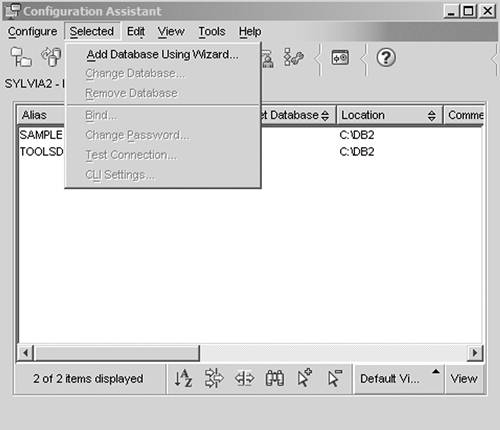 | 2. | The databases that are already cataloged on the client are displayed in the CA window. To add more connections, click Selected and choose Add Database Using Wizard. You will see the Add Database Wizard, shown in Figure 6.18.