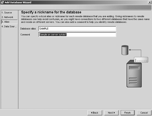 | 6. | In Figure 6.21 you can specify a database alias. This is the name you will use during all connect requests. Click Finish or Next.