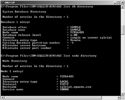 The CA automatically updates the node directory and database directory, as shown in Figure 6.25. Note that the node name is an arbitrary name chosen by the CA. Figure 6.25. Updated node directory and database directory  6.4.2. Configuring a Connection Using Access Profiles in the Configuration Assistant An access profile is a file that contains all the information necessary to create a connection between a client and a server. This process automatically catalogs the DB2 directories on the client. Use access profiles if you have many clients that need to be configured to connect to the same DB2 servers. You can obtain an access profile either from a configured client or from the server itself. If you have a client that has been configured to connect to DB2 servers, use this client's CA to export its configuration to the access profile file. You can then transfer this file to other clients and configure them using this information. You can use the server's CA to export an access profile that contains information about all the instances that have DISCOVER_INST=ENABLE in the Database Manager Configuration file and all databases that have DISCOVER_DB=ENABLE in the database configuration file. You can then transfer this access profile to clients and configure them using the information in this file. 6.4.2.1 Using the Configuration Assistant to Export an Access Profile 1. | In the Configuration Assistant, choose Configure > Export Profile. (You can also do this by using the db2cfexp command.) Figure 6.26 shows the three Export Profile options.