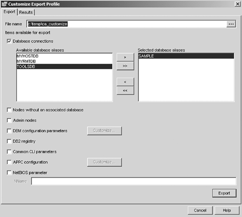 All creates a profile that contains all of the databases cataloged on the system. In addition, the profile includes specific information about the system, such as the DB2 registry variables and Database Manager Configuration. Database Connections creates a profile that contains only the database catalog information. Customize lets you select specific databases that are cataloged on the system. Figure 6.26. Exporting an access profile using the CA