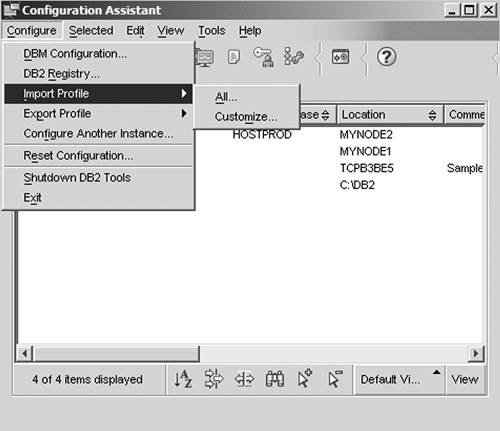 | 6.4.2.2 Using the Configuration Assistant to Import an Access Profile After you have obtained an access profile from either a client or a server, you can use this profile to configure other clients. You transfer the file over to the client you want to configure and start the CA on the client. There are two ways to import an access profile using the Configuration Assistant. 6.4.2.2.1 Importing an Access Profile Using the CA's Import Profile Function 1. | In the CA, choose Configure > Import Profile as shown in Figure 6.29 (You can also do this using the db2cfimp command.)