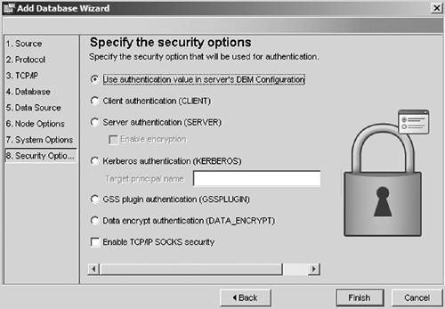 | 8. | In Figure 6.39, choose a security option for this connection and then click Finish. The CA will automatically update DB2 directories.