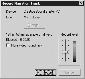 The Record Narration Track dialog box appears listing the sound device that you will use to record the audio, as shown next. If you have more than one sound device installed on your computer, click the Change button and use the drop-down menu to select a different device as desired. When you are ready, click the Record button. If you do not want to hear the existing video soundtrack while you are recording your narration, just click the Mute Video Soundtrack check box.