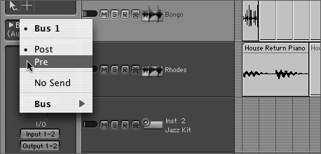 | Exploring Pre and Post Sends Channel Sends can be set to pre or post fader. Pre fader ensures that the Send signal remains constant regardless of the channel's main Volume Fader setting, while post fader means that the level passing through the Send changes as the channel's main fader is raised or lowered. Sends default to post fader, and in most situations this is exactly what you want. For example, with the Sends set to post fader, lowering the Bongo track's level transmits less signal to the Bus 1 channel, which means that lowering the volume of the Bongo track also causes the volume of the reverb to lower. If you were to set the Sends to pre fader, raising or lowering the Bongo track's volume fader would have no effect on the volume of the reverb. Once you start playing around with pre- and post-fader Send settings, it's much easier to see how they work. Let's experiment with the Bongo track now. 1. | Press the spacebar to begin playback.