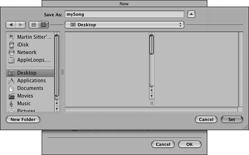 | Creating a Project Folder Logic 7 will now create a project folder to hold the song file, along with all the audio files, EXS instruments and samples, and Space Designer impulse response files (Logic Pro only) used in the song. A project folder ensures that all of the audio needed to produce your song is stored in one easy-to-find location, and this in turn makes it a simple matter to back your song up to a DVD-ROM or transfer it between computers. 1. | Choose File > New (Cmd-N).