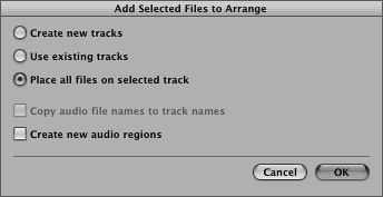 This dialog controls how Logic adds multiple files to Arrange window tracks. The options on offer include: