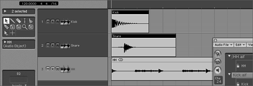 | 2. | In the Audio window, press the Shift key and select both the Kick and Snare audio files.