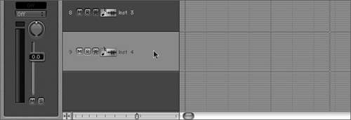 | The song you're working on has four empty Audio Instrument tracks, but no remaining audio tracks. The Bongo Apple Loop you just added filled the last audio track with sound, so before you can add any more Apple Loops to the song, you'll need to create a few more audio tracks. Let's get this housekeeping out of the way now so we can have fun later. Adding Tracks In Logic, all tracks listed in the Arrange window must be assigned to channels. Channels are simply paths that audio and MIDI use to travel into and out of Logic. For example, MIDI messages travel through MIDI channels as they leave Logic and travel to your MIDI interface and then to another MIDI device such as a hardware synthesizer or digital-effects unit. Similarly, audio tracks are a type of audio channel that can read recorded audio, like a vocal or guitar part, off the hard drive and send it to your sound card's outputs. To take this a bit further, Audio Instrument channels use sound generated by one of Logic's internal synthesizers, say an es2, and then send it to a sound card output. You will learn more about MIDI and audio channels in the "Customizing Your Setup" section of this book. For now, just keep this in mind: Each Arrange window track must be assigned to a channel, or you will have no sound because there's no channel for the signal to follow out of Logic. Creating a new track in Logic is a two-part process: First you create the track, then you assign it to a channel. Let's go through the process now by adding a few tracks to the song. 1. | In the Arrange window, select the track named Audio 4.