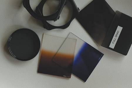 Figure 2.6. A variety of filters can expand your ability to work in unusual lighting conditions, as well as let you be more creative. At left is a circular polarizer, while in the center and at right are graduated filters. (Photo by Reed Hoffmann)