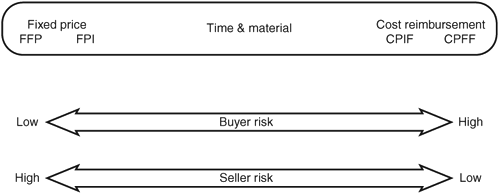 Firm fixed price (FFP) (or lump sum) | The work is completed for a predetermined price. | Benefits the buyer. Seller at risk if item isn't clearly defined. Seller must manage changes closely. | Fixed price incentive (FPI) | Similar to fixed price but an incentive is offered for early completion. | More administrative effort for buyer and seller. | Purchase order | A form of fixed price, usually for off-the-shelf items. | Optimal for both parties when item is a commodity (such as computers). | Cost reimbursement, includes CPF, CPPC, CPFF, and CPIF (see the following exam alert) | The seller is reimbursed for his costs, plus an additional fee. | Benefits the seller because his cost is covered. Risk to buyer if costs are higher than anticipated; the budget is affected. | Time and material (T&M) | Hybrid arrangement between fixed price and cost reimbursement where elements of both are used; a fixed unit rate can be set for certain elements of work while other components are completely reimbursable. For example, a programmer might be acquired at $125 per hour without defining how long they will be used. | Seller benefits if amount of work can be extended, which affects the buyer's budget. |