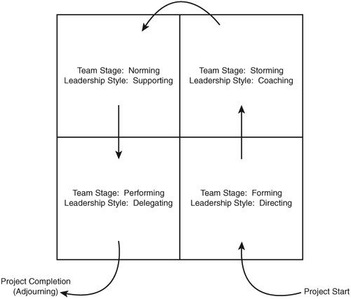 Team Formation The theories presented in Table 5.4 focus primarily on development of individuals. PMI also discusses how the team forms as a cohesive unit. A leading theory in team development was developed by Bruce Tuckman . His theory states that teams go through stages; forming, storming, norming, and performing. He later added a fifth stage, adjourning. His model is summarized in Table 5.5. Table 5.5. Tuckman's Model on Team FormationStage | Description |