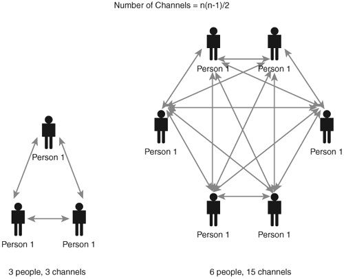 Blanchard's situational leadership model, seen in Table 5.4, can also apply to teams. The four leadership styles can be used in Tuckman's four stages of development. Figure 5.1 compares these two theories. Figure 5.1. Comparison of situational leadership and team formation.  Distributing Information Information distribution is the task of keeping stakeholders informed. This includes communication outlined in the communication plan as well as responding to ad-hoc requests. The communication must be both timely and accurate. A project manager spends a large portion of his time communicating. The number of communication channels is an exponential relationship. See Figure 5.2 for the formula and examples for calculating communication channels. In the example, the first team has three people (N=3), so the formula is Figure 5.2. Communication channels.  3 x (3 - 1)/2 = 3 In the second figure , there are six team members, so the formula is 6 x (6 - 1)/2 = 15  | Be able to calculate the number of communication channels given the number of team members. |