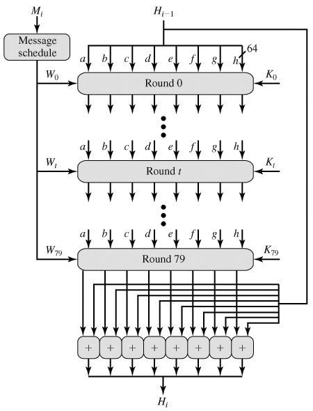 Figure 12.2. SHA-512 Processing of a Single 1024-Bit Block  Each round takes as input the 512-bit buffer value abcdefgh, and updates the contents of the buffer. At input to the first round, the buffer has the value of the intermediate hash value, Hi-1. Each round t makes use of a 64-bit value Wt derived from the current 1024-bit block being processed (Mi) These values are derived using a message schedule described subsequently. Each round also makes use of an additive constant Kt where 0 79 indicates one of the 80 rounds. These words represent the first sixty-four bits of the fractional parts of the cube roots of the first eighty prime numbers. The constants provide a "randomized" set of 64-bit patterns, which should eliminate any regularities in the input data.
