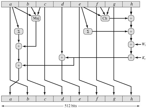 Figure 12.3. Elementary SHA-512 Operation (single round)  It remains to indicate how the 64-bit word values Wt are derived from the 1024-bit message. Figure 12.4 illustrates the mapping. The first 16 values of Wt are taken directly from the 16 words of the current block. The remaining values are defined as follows:  where  ROTRn(x) | = circular right shift (rotation) of the 64-bit argument x by n bits | SHRn(x) | = left shift of the 64-bit argument x by n bits with padding by zeros on the right |