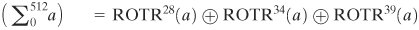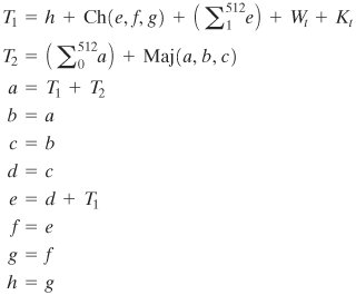 [Page 357]  ROTRn(x) | = circular right shift (rotation) of the 64-bit argument x by n bits | Wt | = a 64-bit word derived from the current 512-bit input block | Kt | = a 64-bit additive constant | + | = addition modulo 264 |