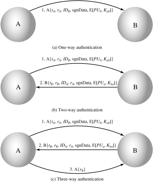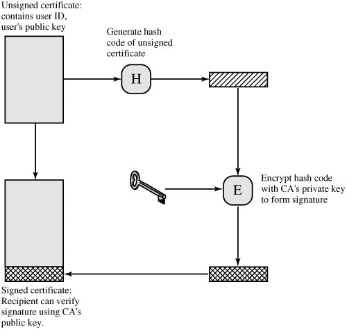 [Page 419 (continued)]14.2. X.509 Authentication Service ITU-T recommendation X.509 is part of the X.500 series of recommendations that define a directory service. The directory is, in effect, a server or distributed set of servers that maintains a database of information about users. The information includes a mapping from user name to network address, as well as other attributes and information about the users. X.509 defines a framework for the provision of authentication services by the X.500 directory to its users. The directory may serve as a repository of public-key certificates of the type discussed in Chapter 9. Each certificate contains the public key of a user and is signed with the private key of a trusted certification authority. In addition, X.509 defines alternative authentication protocols based on the use of public-key certificates. X.509 is an important standard because the certificate structure and authentication protocols defined in X.509 are used in a variety of contexts. For example, the X.509 certificate format is used in S/MIME (Chapter 15), IP Security (Chapter 16), and SSL/TLS and SET (Chapter 17). X.509 was initially issued in 1988. The standard was subsequently revised to address some of the security concerns documented in [IANS90] and [MITC90]; a revised recommendation was issued in 1993. A third version was issued in 1995 and revised in 2000. X.509 is based on the use of public-key cryptography and digital signatures. The standard does not dictate the use of a specific algorithm but recommends RSA. The digital signature scheme is assumed to require the use of a hash function. Again, the standard does not dictate a specific hash algorithm. The 1988 recommendation included the description of a recommended hash algorithm; this algorithm has since been shown to be insecure and was dropped from the 1993 recommendation. Figure 14.3 illustrates the generation of a public-key certificate. [Page 420] Figure 14.3. Public-Key Certificate Use  Certificates The heart of the X.509 scheme is the public-key certificate associated with each user. These user certificates are assumed to be created by some trusted certification authority (CA) and placed in the directory by the CA or by the user. The directory server itself is not responsible for the creation of public keys or for the certification function; it merely provides an easily accessible location for users to obtain certificates. Figure 14.4a shows the general format of a certificate, which includes the following elements: Version: Differentiates among successive versions of the certificate format; the default is version 1. If the Issuer Unique Identifier or Subject Unique Identifier are present, the value must be version 2. If one or more extensions are present, the version must be version 3. Serial number: An integer value, unique within the issuing CA, that is unambiguously associated with this certificate. Signature algorithm identifier: The algorithm used to sign the certificate, together with any associated parameters. Because this information is repeated in the Signature field at the end of the certificate, this field has little, if any, utility. Issuer name: X.500 name of the CA that created and signed this certificate. [Page 421]Period of validity: Consists of two dates: the first and last on which the certificate is valid. Subject name: The name of the user to whom this certificate refers. That is, this certificate certifies the public key of the subject who holds the corresponding private key. Subject's public-key information: The public key of the subject, plus an identifier of the algorithm for which this key is to be used, together with any associated parameters. Issuer unique identifier: An optional bit string field used to identify uniquely the issuing CA in the event the X.500 name has been reused for different entities. Subject unique identifier: An optional bit string field used to identify uniquely the subject in the event the X.500 name has been reused for different entities. Extensions: A set of one or more extension fields. Extensions were added in version 3 and are discussed later in this section. Signature: Covers all of the other fields of the certificate; it contains the hash code of the other fields, encrypted with the CA's private key. This field includes the signature algorithm identifier. Figure 14.4. X.509 Formats The unique identifier fields were added in version 2 to handle the possible reuse of subject and/or issuer names over time. These fields are rarely used. [Page 422]The standard uses the following notation to define a certificate: CA<<A>> = CA {V, SN, AI, CA, TA, A, Ap} where Y <<X>> | = the certificate of user X issued by certification authority Y | Y {I} | = the signing of I by Y. It consists of I with an encrypted hash code appended |