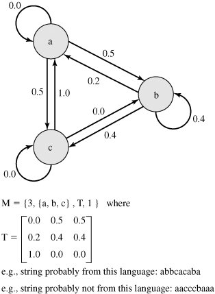 In general, a Markov model is a quadruple [m, A, T, k], where m is the number of states in the model, A is the state space, T is the matrix of transition probabilities, and k is the order of the model. For a kth-order model, the probability of making a transition to a particular letter depends on the previous k letters that have been generated. Figure 18.5 shows a simple first-order model.