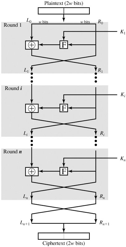 Figure 3.2 depicts the structure proposed by Feistel. The inputs to the encryption algorithm are a plaintext block of length 2w bits and a key K. The plaintext block is divided into two halves, L0 and R0. The two halves of the data pass through n rounds of processing and then combine to produce the ciphertext block. Each round i has as inputs Li-1 and Ri-1, derived from the previous round, as well as a subkey Ki, derived from the overall K. In general, the subkeys Ki are different from K and from each other.