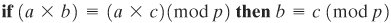 Multiplicative inverse (w1) | For each w Zw 0, there exists a Zw x z 1 (mod Because w is relatively prime to p, if we multiply all the elements of Zp by w, the resulting residues are all of the elements of Zp permuted. Thus, exactly one of the residues has the value 1. Therefore, there is some integer Zp in that, when multiplied by w, yields the residue 1. That integer is the multiplicative inverse of w, designated w1. Therefore, Zp is in fact a finite field. Further, Equation (4.3) is consistent with the existence of a multiplicative inverse and can be rewritten without the condition: Equation 4-5  Multiplying both sides of Equation (4.5) by the multiplicative inverse of a, we have: ((a1) x a x b) | ((a x c)(mod p)