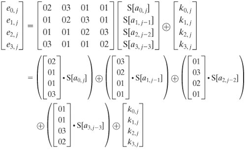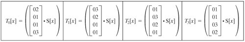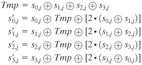 The multiplication by {02} involves a shift and a conditional XOR. Such an implementation may be vulnerable to a timing attack of the sort described in Section 3.4. To counter this attack and to increase processing efficiency at the cost of some storage, the multiplication can be replaced by a table lookup. Define the 256-byte table X2, such that X2[i] = {02} · i. Then Equation Set (5.9) can be rewritten as