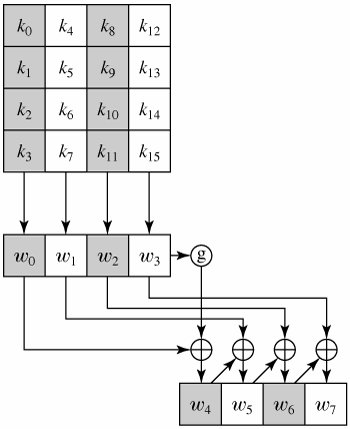 The key is copied into the first four words of the expanded key. The remainder of the expanded key is filled in four words at a time. Each added word w[i] depends on the immediately preceding word, w[i 1], and the word four positions back,w[i 4]. In three out of four cases, a simple XOR is used. For a word whose position in the w array is a multiple of 4, a more complex function is used. Figure 5.6 illustrates the generation of the first eight words of the expanded key, using the symbol g to represent that complex function. The function g consists of the following subfunctions: