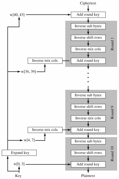 As was mentioned, the AES decryption cipher is not identical to the encryption cipher (Figure 5.1). That is, the sequence of transformations for decryption differs from that for encryption, although the form of the key schedules for encryption and decryption is the same. This has the disadvantage that two separate software or firmware modules are needed for applications that require both encryption and decryption. There is, however, an equivalent version of the decryption algorithm that has the same structure as the encryption algorithm. The equivalent version has the same sequence of transformations as the encryption algorithm (with transformations replaced by their inverses). To achieve this equivalence, a change in key schedule is needed.
