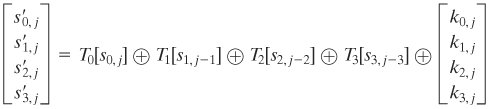In the second equation, we are expressing the matrix multiplication as a linear combination of vectors. We define four 256-word (1024-byte) tables as follows: