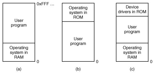 [Page 374 (continued)]4.1. Basic Memory Management Memory management systems can be divided into two basic classes: those that move processes back and forth between main memory and disk during execution (swapping and paging), and those that do not. The latter are simpler, so we will study them first. Later in the chapter we will examine swapping and paging. Throughout this chapter the reader should keep in mind that swapping and paging are largely artifacts caused by the lack of sufficient main memory to hold all programs and data at once. If main memory ever gets so large that there is truly enough of it, the arguments in favor of one kind of memory management scheme or another may become obsolete. On the other hand, as mentioned above, software seems to grow as fast as memory, so efficient memory management may always be needed. In the 1980s, there were many universities that ran a timesharing system with dozens of (more-or-less satisfied) users on a 4 MB VAX. Now Microsoft recommends having at least 128 MB for a single-user Windows XP system. The trend toward multimedia puts even more demands on memory, so good memory management is probably going to be needed for the next decade at least. 4.1.1. Monoprogramming without Swapping or Paging The simplest possible memory management scheme is to run just one program at a time, sharing the memory between that program and the operating system. Three variations on this theme are shown in Fig. 4-1. The operating system may be at the bottom of memory in RAM (Random Access Memory), as shown in Fig. 4-1(a), or it may be in ROM (Read-Only Memory) at the top of memory, as shown in Fig. 4-1(b), or the device drivers may be at the top of memory in a ROM and the rest of the system in RAM down below, as shown in Fig. 4-1(c). The first model was formerly used on mainframes and minicomputers but is rarely used any more. The second model is used on some palmtop computers and embedded systems. The third model was used by early personal computers (e.g., running MS-DOS), where the portion of the system in the ROM is called the BIOS (Basic Input Output System). [Page 375] Figure 4-1. Three simple ways of organizing memory with an operating system and one user process. Other possibilities also exist.  When the system is organized in this way, only one process at a time can be running. As soon as the user types a command, the operating system copies the requested program from disk to memory and executes it. When the process finishes, the operating system displays a prompt character and waits for a new command. When it receives the command, it loads a new program into memory, overwriting the first one. 4.1.2. Multiprogramming with Fixed Partitions Except on very simple embedded systems, monoprogramming is hardly used any more. Most modern systems allow multiple processes to run at the same time. Having multiple processes running at once means that when one process is blocked waiting for I/O to finish, another one can use the CPU. Thus multiprogramming increases the CPU utilization. Network servers always have the ability to run multiple processes (for different clients) at the same time, but most client (i.e., desktop) machines also have this ability nowadays. The easiest way to achieve multiprogramming is simply to divide memory up into n (possibly unequal) partitions. This partitioning can, for example, be done manually when the system is started up. When a job arrives, it can be put into the input queue for the smallest partition large enough to hold it. Since the partitions are fixed in this scheme, any space in a partition not used by a job is wasted while that job runs. In Fig. 4-2(a) we see how this system of fixed partitions and separate input queues looks. Figure 4-2. (a) Fixed memory partitions with separate input queues for each partition. (b) Fixed memory partitions with a single input queue. (This item is displayed on page 376 in the print version) The disadvantage of sorting the incoming jobs into separate queues becomes apparent when the queue for a large partition is empty but the queue for a small partition is full, as is the case for partitions 1 and 3 in Fig. 4-2(a). Here small jobs have to wait to get into memory, even though plenty of memory is free. An alternative organization is to maintain a single queue as in Fig. 4-2(b). Whenever a partition becomes free, the job closest to the front of the queue that fits in it could be loaded into the empty partition and run. Since it is undesirable to waste a large partition on a small job, a different strategy is to search the whole input queue whenever a partition becomes free and pick the largest job that fits. Note that the latter algorithm discriminates against small jobs as being unworthy of having a whole partition, whereas usually it is desirable to give the smallest jobs (often interactive jobs) the best service, not the worst. [Page 376] One way out is to have at least one small partition around. Such a partition will allow small jobs to run without having to allocate a large partition for them. Another approach is to have a rule stating that a job that is eligible to run may not be skipped over more than k times. Each time it is skipped over, it gets one point. When it has acquired k points, it may not be skipped again. This system, with fixed partitions set up by the operator in the morning and not changed thereafter, was used by OS/360 on large IBM mainframes for many years. It was called MFT (Multiprogramming with a Fixed number of Tasks or OS/MFT). it is simple to understand and equally simple to implement: incoming jobs are queued until a suitable partition is available, at which time the job is loaded into that partition and run until it terminates. However, nowadays, few, if any, operating systems, support this model, even on mainframe batch systems. [Page 377]4.1.3. Relocation and Protection Multiprogramming introduces two essential problems that must be solved relocation and protec