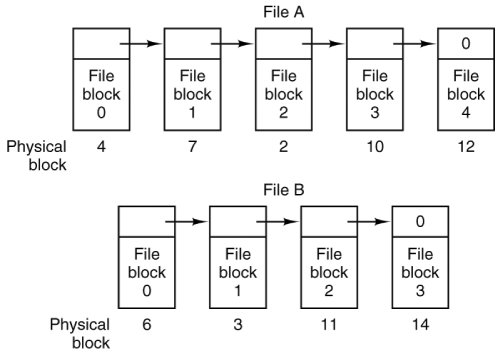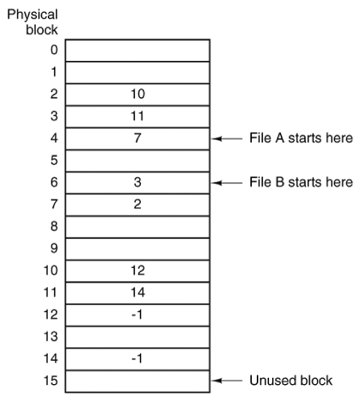 [Page 497 (continued)]5.3. File System Implementation Now it is time to turn from the user's view of the file system to the implementer's view. Users are concerned with how files are named, what operations are allowed on them, what the directory tree looks like, and similar interface issues. Implementers are interested in how files and directories are stored, how disk space is managed, and how to make everything work efficiently and reliably. In the following sections we will examine a number of these areas to see what the issues and trade-offs are. 5.3.1. File System Layout File systems usually are stored on disks. We looked at basic disk layout in Chap. 2, in the section on bootstrapping MINIX 3. To review this material briefly, most disks can be divided up into partitions, with independent file systems on each partition. Sector 0 of the disk is called the MBR (Master Boot Record) and is used to boot the computer. The end of the MBR contains the partition table. This table gives the starting and ending addresses of each partition. One of the partitions in the table may be marked as active. When the computer is booted, the BIOS reads in and executes the code in the MBR. The first thing the MBR program does is locate the active partition, read in its first block, called the boot block, and execute it. The program in the boot block loads the operating system contained in that partition. For uniformity, every partition starts with a boot block, even if it does not contain a bootable operating system. Besides, it might contain one in the some time in the future, so reserving a boot block is a good idea anyway. The above description must be true, regardless of the operating system in use, for any hardware platform on which the BIOS is to be able to start more than one operating system. The terminology may differ with different operating systems. For instance the master boot record may sometimes be called the IPL (Initial Program Loader), Volume Boot Code, or simply masterboot. Some operating systems do not require a partition to be marked active to be booted, and provide a menu for the user to choose a partition to boot, perhaps with a timeout after which a default choice is automatically taken. Once the BIOS has loaded an MBR or boot sector the actions may vary. For instance, more than one block of a partition may be used to contain the program that loads the operating system. The BIOS can be counted on only to load the first block, but that block may then load additional blocks if the implementer of the operating system writes the boot block that way. An implementer can also supply a custom MBR, but it must work with a standard partition table if multiple operating systems are to be supported. [Page 498] On PC-compatible systems there can be no more than four primary partitions because there is only room for a four-element array of partition descriptors between the master boot record and the end of the first 512-byte sector. Some operating systems allow one entry in the partition table to be an extended partition which points to a linked list of logical partitions. This makes it possible to have any number of additional partitions. The BIOS cannot start an operating system from a logical partition, so initial startup from a primary partition is required to load code that can manage logical partitions. An alternative to extended partitions is used by MINIX 3, which allows a partition to contain a subpartition table. An advantage of this is that the same code that manages a primary partition table can manage a subpartition table, which has the same structure. Potential uses for subpartitions are to have different ones for the root device, swapping, the system binaries, and the users' files. In this way, problems in one subpartition cannot propagate to another one, and a new version of the operating system can be easily installed by replacing the contents of some of the subpartitions but not all. Not all disks are partitioned. Floppy disks usually start with a boot block in the first sector. The BIOS reads the first sector of a disk and looks for a magic number which identifies it as valid executable code, to prevent an attempt to execute the first sector of an unformatted or corrupted disk. A master boot record and a boot block use the same magic number, so the executable code may be either one. Also, what we say here is not limited to electromechanical disk devices. A device such as a camera or personal digital assistant that uses nonvolatile (e.g., flash) memory typically has part of the memory organized to simulate a disk. Other than starting with a boot block, the layout of a disk partition varies considerably from file system to file system. A UNIX-like file system will contain some of the items shown in Fig. 5-8. The first one is the superblock. It contains all the key parameters about the file system and is read into memory when the computer is booted or the file system is first touched. Figure 5-8. A possible file system layout. (This item is displayed on page 499 in the print version) Next might come information about free blocks in the file system. This might be followed by the i-nodes, an array of data structures, one per file, telling all about the file and where its blocks are located. After that might come the root directory, which contains the top of the file system tree. Finally, the remainder of the disk typically contains all the other directories and files. [Page 499]5.3.2. Implementing Files Probably the most important issue in implementing file storage is keeping track of which disk blocks go with which file. Various methods are used in different operating systems. In this section, we will examine a few of them. Contiguous Allocation The simplest allocation scheme is to store each file as a contiguous run of disk blocks. Thus on a disk with 1-KB blocks, a 50-KB file would be allocated 50 consecutive blocks. Contiguous disk space allocation has two significant advantages.