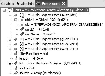 | | | 4. | Now you know that the data is being retrieved correctly. Next, you want to be sure it is assigned to the units variable. Click the Expressions view tab and then right-click in the Expressions view and select Add Watch Expression. Enter units and then click OK. Notice that the variable is defined because it is declared as an ArrayCollection in the application. Drill down into the variable; you will see it does not have any values.