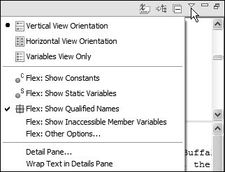| | | 8. | In the Variables view, be sure to expand the variable to see all the variables within the scope. Right-click in the Variables view and select Find Variable. Start typing categories until you can see that variable highlighted in the Variables view. Click OK to close the Find Variable window, and then check to be sure the correct data stored in an ArrayCollection is in categories. Right-click in the Variables view again and select Find Variable. Start typing foodColl until you can see that variable highlighted in the Variables view. Click OK to close the Find Variable window and then ensure that the correct XML data is in foodColl.