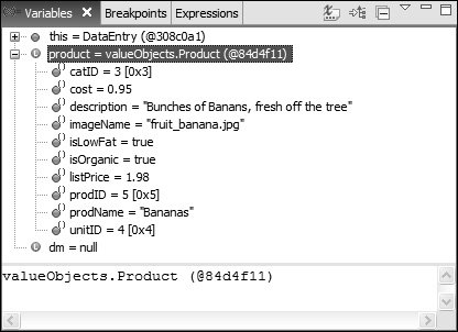 | | | 10. | Select the Resume command from the Debug view. Return to the browser where the application is running and select a product from the Tree on the Update/Delete Product tab. Make a change to the product information and then click Update. Be sure that you are viewing the Flex Debugging perspective in Flex Builder. In the Variables view, check to be sure that Product has your new value.