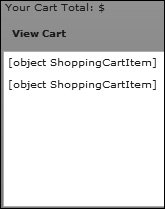 <mx:List dataProvider="{cart.aItems}" width="100%"/> The List control is specifically designed to handle complex data structures. In this case, you are passing the ArrayCollection to the List control. You will see only that a ShoppingCartItem is added to the cart, not which one specifically. This is the default way to display an item. If more than one Product is added, all will be displayed in the List control (the cart).