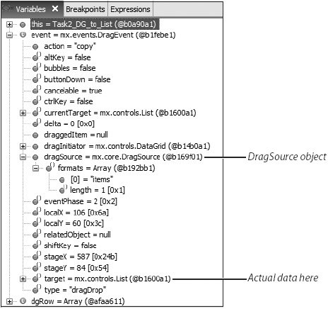 Setting this property did two obvious things: it enabled dragging and created the drag proxy, the image attached to the mouse pointer when dragging. Another nonvisual event occurred at the same time, and that is a DragSource object was created to hold the data. The data is associated with a format named items, as the following screenshot from the debugger shows: