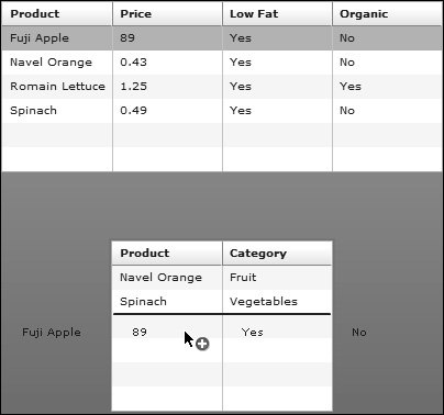 Notice that the entire set of data for the row is dragged, not just the visible properties in the DataGrid. The category column is not displayed in the first DataGrid, but when dropped, that column is displayed in the second DataGrid. This shows you that all the data for the row is in the DragSource, not just the rows that happen to be displayed.