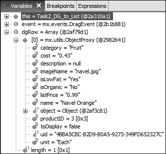 | 7. | Debug the application and drag a row to the List. When you drop the drag proxy, the process flow will return to Flex Builder and then you should view the Debugging perspective. Examine the dgRow variable value in the Variables view. You should then see that the variable contains all the data from that DataGrid row.