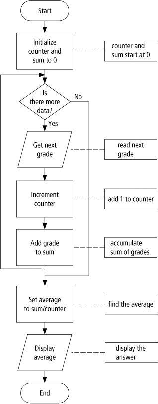 Discussion: The average grade equals the sum of all grades divided by the number of students. We need a loop to read and then add (accumulate) the grades for each student in the class. Inside the loop, we also need to total (count) the number of students in the class. See Figures 2.8 to 2.10.