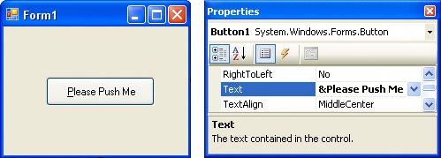 8. | From the Properties window, edit the Text setting by inserting an ampersand (&) before the first letter, P. Press the Enter key, and notice that the first letter P on the button is now underlined. See Figure 3.10. Pressing Alt+P while the program is running triggers the same event as clicking the button. However, the button will not appear to move in and out. Here, P is referred to as the access key for the button. (The access key is always specified as the character following the ampersand.) |
