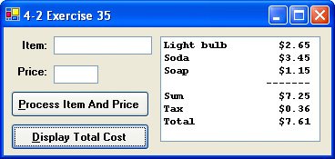 | 35. | Write a program to produce a sales receipt. Each time the user clicks on a button, an item and its price should be read from a pair of text boxes and displayed in a list box. Use a class-level variable to track the sum of the prices. When the user clicks on a second button (after all the entries have been made), the program should display the sum of the prices, the sales tax (5 percent of total), and the total amount to be paid. Figure 4.5 shows a sample output of the program. |