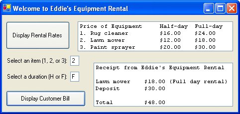[Page 243 (continued)] Table 5.15 gives the price schedule for Eddie's Equipment Rental. Full-day rentals cost one-and-a-half times half-day rentals. Write a program that displays Table 5.15 in a list box when an appropriate button is clicked and displays a bill in another list box based on the item number and time period chosen by a customer. The bill should include a $30.00 deposit. A possible form layout and sample run are shown in Figure 5.9. [Page 244]Table 5.15. Price schedule for Eddie's Equipment Rental. (This item is displayed on page 243 in the print version) Piece of Equipment | Half-Day | Full-Day |