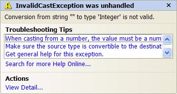 | 5. | Private Sub btnDisplay_Click(...) Handles btnDisplay.Click Dim num As Integer 'Assume that txtBox is empty Try num = CInt(txtBox.Text) txtOutput.Text = "Your number is " & num Catch txtOutput.Text = "You must enter a number." End Try End Sub | |||