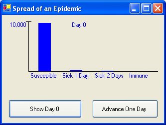 Write a program that displays successive bar graphs illustrating the progress of the epidemic. When the "Show Day 0" button is pressed, the bar graph should show the distribution for day 0 (Figure 9.40). Each time the "Advance One Day" button is pressed, a bar graph showing the distribution for the next day should appear. Figure 9.41 shows the bar graph after this button has been pressed three times. Figure 9.40. Initial distribution.  Figure 9.41. Distribution on day 3 of epidemic.  |