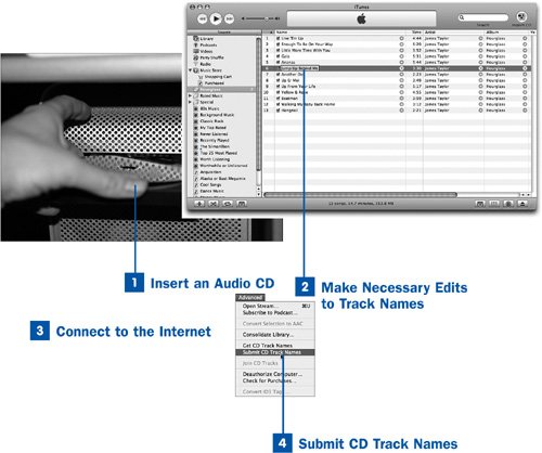 Insert an Audio CD Select an audio CD that you want to add to your iTunes Library. Insert it into the computer's CD drive and close the drive door. Wait for iTunes to populate the CD's track listing; if you don't have an Internet connection, the tracks are given generic names, such as Track 01, Track 02, and so on. Make Necessary Edits to Track Names Using the info window or the displayed fields in the song listing pane, enter the proper names for the tracks on the CD. The best approach is to select all the songs on the disc, choose File, Get Info (or right-click the song and choose Get Info from the context menu), and make all the changes at once to as many fields as possible. Make sure that the CD's title is correct; if it's part of a multiple-disc set, fill in the Disc Number fields rather than putting an identifier such as [1/3] in the title. If you can, fill in the Composer, Genre, and Year fields, too. (Year should reflect the original release date of the album so that the music on the disc can be accurately pegged to a certain era in musical history.) Click OK when you're done; all the fields are updated to reflect your changes. Connect to the Internet If you're not connected to the Internet already, connect now. Dial up your modem or connect to the wireless or wired network, depending on your circumstances. Submit CD Track Names Choose Advanced, Submit CD Track Names. iTunes connects to the Gracenote site, checks the available categories, and submits your information. The information submitted uses the CD's track lengths as a key to find the correct database entry; it uses your edited track names as the information to submit. If an entry for your CD is already in the database, your new information will supersede it. That's all there is to it. The Gracenote staff checks your submission for accuracy and adds it to the database usually within a day or two. Don't expect feedback or a thank-you from Gracenotebut from now on, anyone trying to import the same CD whose information you just submitted will get your more accurate information instead of what was available before. |