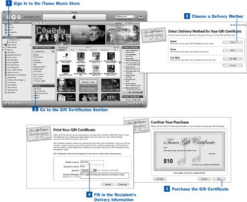 Sign In to the iTunes Music Store Choose Music Store from the Source pane in the iTunes window and connect to the store. If you are not already signed in, click the Sign In button in the upper-right corner and provide your Apple ID (or AOL screen name) and password to sign yourself in. Go to the Gift Certificates Section Click the Gift Certificates link in the Account box on the Music Store's home page. You are given a choice to redeem a certificate that was sent to you or to buy a new one; click Buy Now. Choose a Delivery Method A gift certificate can be delivered to the recipient in one of three ways: It can be sent through Email, with a confirmation code included in the message; it can be sent as a professionally printed card mailed through the U.S. Mail; or you can Print it yourself and hand it to the person in an envelope with a nice ribbon on it, or however you like to wrap your gifts. Choose the method that most appeals to you. Fill In the Recipient's Delivery Information Depending on the delivery method you chose, you now have to enter some basic information. For emailed certificates, enter your name, the recipient's name, and the recipient's email address (twice, to eliminate the possibility of typos), and select an amount from $10 to $200. Type a message to go with the giftmake sure that the recipient realizes that he must redeem this gift certificate by clicking the link in the message and that it's not just another piece of spam! A printed gift certificate just requires you to fill in your name and the recipient's name, choose an amount, and fill in a brief personal message. When you buy the gift, the certificate is sent to your printer, and the names and messages are printed as part of the certificate, which you can then fold and package any way you like for gift-giving. If you chose the U.S. Mail option, your web browser launches and displays a page at the online Apple Store where you can purchase the card for delivery through the mail. The card printed in this way is on nice thick paper, with your name and personal message included on it. You'll have to use the online Apple Store's purchasing and billing system to complete the purchase. There is no extra charge, beyond the face value of the certificate, for a printed and delivered copy. Purchase the Gift Certificate Click Continue after filling in all the required information. After confirming your Apple ID and password, the next screen is a confirmation where you can preview your gift certificate and go back if you notice an error. Click Buy when you're satisfied. Your credit card is billed, the same as if you had bought the music yourself in the specified amount. Depending on the delivery method you selected, the certificate is emailed, prepared for physical delivery, or formatted for printing. Note If you chose to print the certificate yourself, you're given the opportunity to print it right now or to print it sometime in the future by going to your account information page. (Click your Apple ID in the Account box in the upper-right corner of the iTunes window, enter your password when prompted, and click View Account.) Click Purchase History to view everything you've ever bought through the iTunes Music Store, including the gift certificate you just purchased. Click the gray arrow icon to see the certificate in more detail, and then click Print to print a new copy. Because a gift certificate can only be redeemed once, you can print as many copies of it as necessary. |